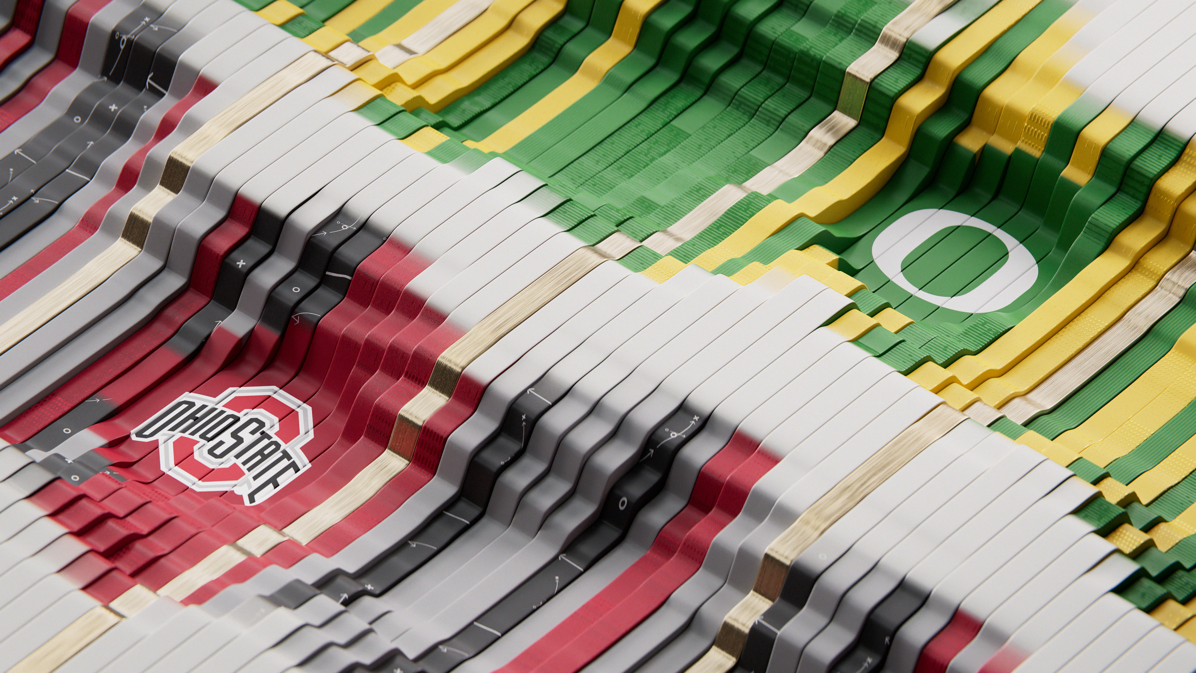 Our 2D graphic library forms the cornerstone of it all, driving both the dynamic 2D animations and immersive 3D designs we've built. Organizing metaphors were informed by the most dog-eared pages in the football playbook. The pacing? All underscored by the sport's signature intensity. The dynamism was largely inspired by the boundless energy of the fans, which college football wouldn't be the same without. The library captures the essence of every play, creating a cohesive visual identity that is grounded in football.
